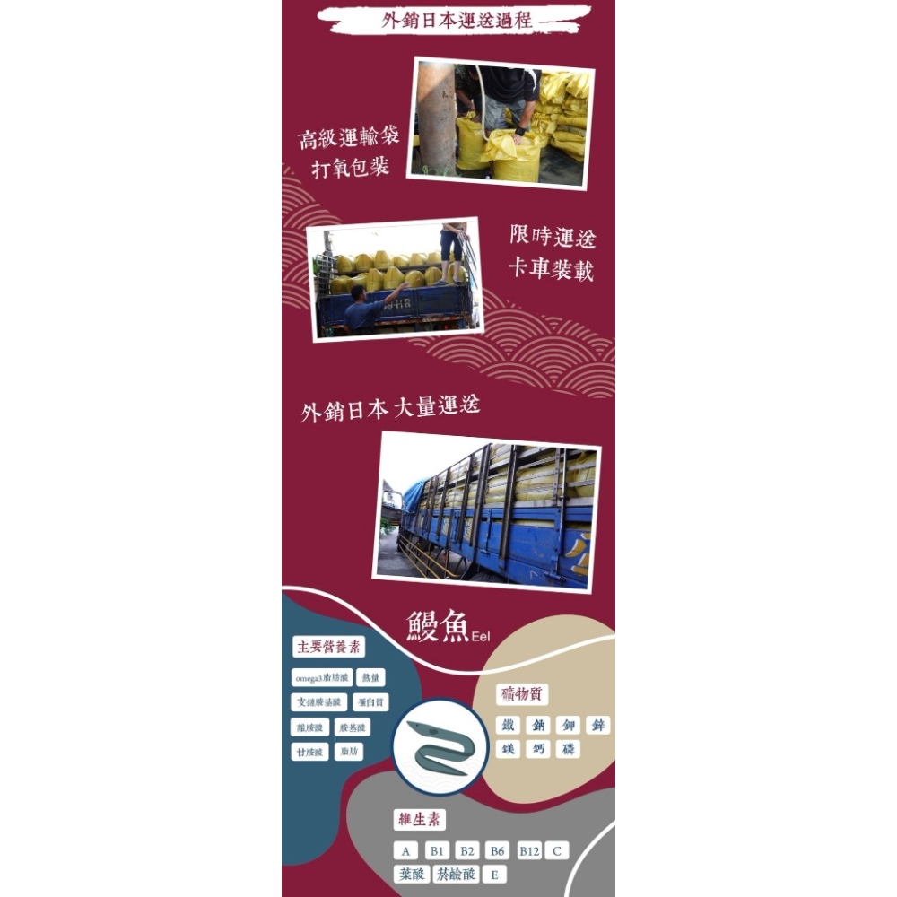 累積近半世紀養殖經驗,40年外銷日本,嚴選優質產品,提供最安心無虞的生鮮美食,請安心選購!鰻魚的營養成分比鱸魚、雞肉、牛肉等 高得多,維生素、礦物質和微量元素含量更是陸上動物所不能相比,鰻魚是含EPA和DHA最高的魚類之一。