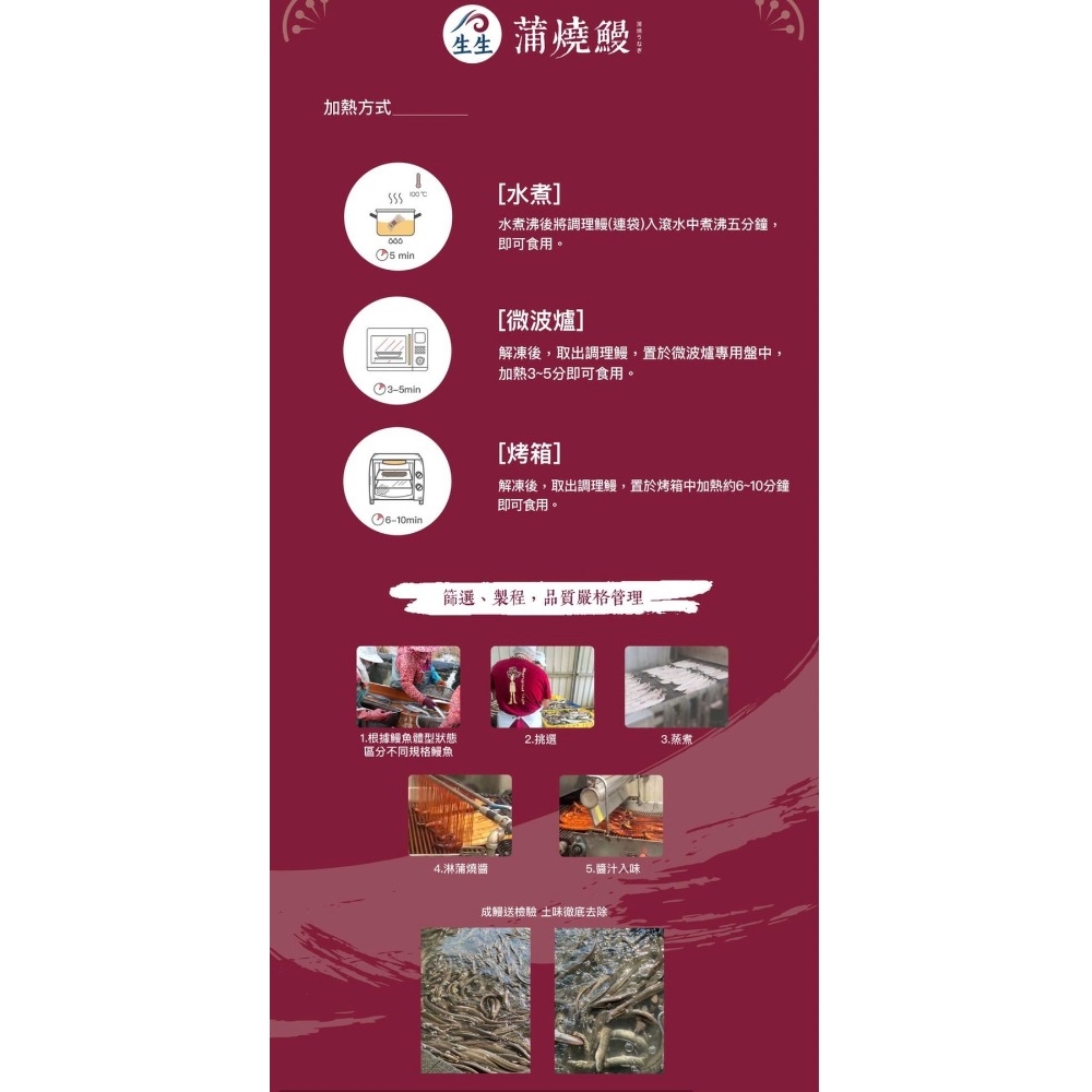 2.水煮:煮沸後將調理鰻(連袋)於入滾水中煮沸五分鐘,即可食用。